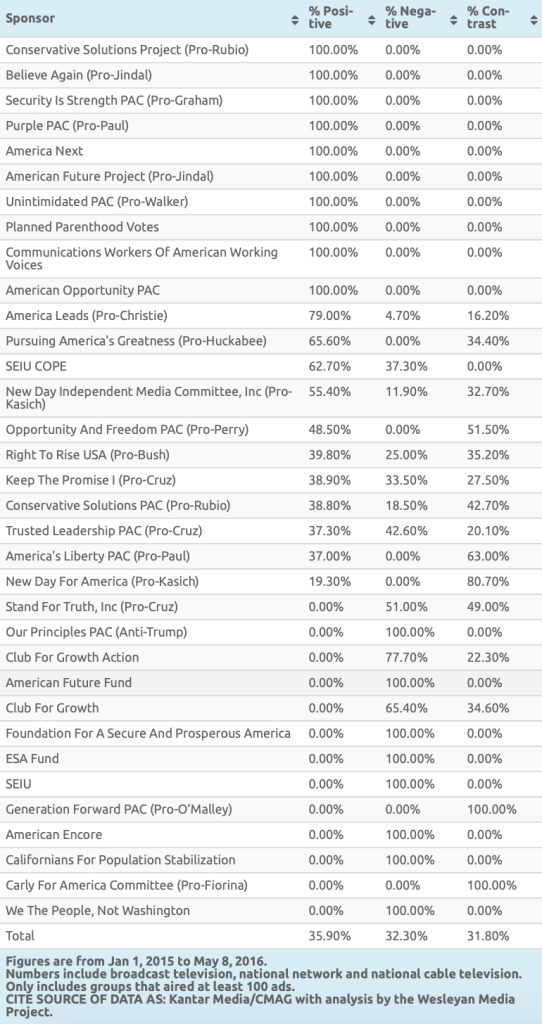 This chart breaks down the tone of ads produced by 34 major political action groups during the 2016 election.4 The first thing to notice about this chart is the sheer number of groups producing ads. There are twice as many groups advertising as there are candidates in the race. Additionally, while the candidates aired largely positive ads, only 36% of all ads produced by groups were positive while some 32% were strictly negative. Eight groups, including Our Principles PAC, American Future Fund, and American Encore, aired only negative attack ads. It is interesting to note that many of the groups running exclusively negative ads were often Republican support groups airing ads attacking Donald Trump.